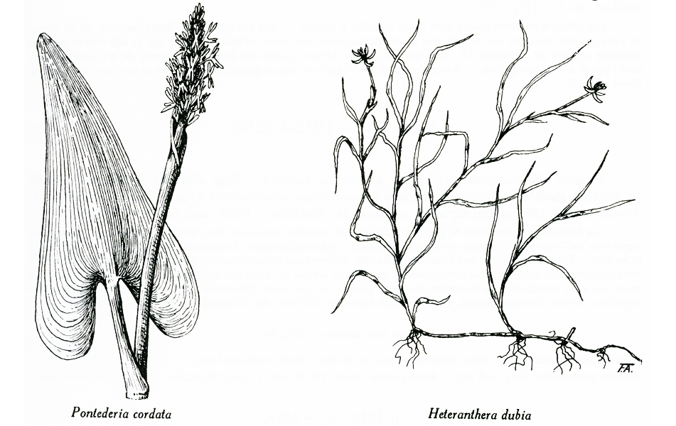 Pontederia : P. cordata, sommité florifère. —Heteranthera : H. dubia, plante entière.