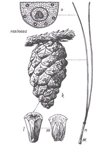 Pinus resinosa, (k) cône, (1) face dorsale d'une écaille, (m) graines sur face ventrale d'une
