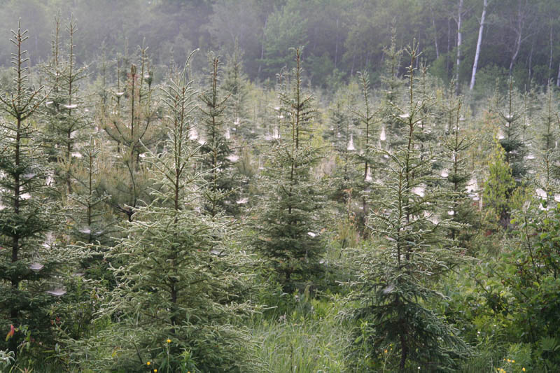 Saint-Luc-de-Vincennes, 3e rang, plantation, toiles d'araignées dans la rosée, le jeudi 18 juin 2009 06:21, photo Picea_mariana_001_800. |