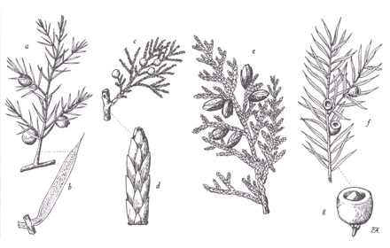 (a) cônes, (b) face dorsale d'une écaille, (c) graines sur face ventrale d'une